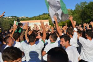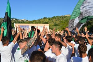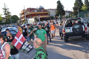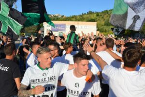 Scene di (stra)ordinaria follia nel tardo pomeriggio al rientro della squadra a Chieti. La Curva Volpi ha atteso il ritorno allo stadio Angelini del pullman con la comitiva neroverde a bordo per tributare a tutti i protagonisti della promozione in serie D, giocatori e staff, un’accoglienza trionfale. Slogan, applausi, bandiere, un tripudio mai visto. Entusiasmo enorme, Lucarelli e i suoi non hanno nascosto la loro grande gioia per questa enorme dimostrazione di affetto. Una accoglienza calorosa era già stata riservata al Chieti dopo la vittoria all’Aquila del 2 giugno scorso, ma nulla di neanche lontanamente paragonabile a quella che oggi ha inscenato la Curva Volpi. E per domenica,i, ultima gara del torneo, contro l’Angolana allo stadio Angelini la festa sarà ancor più grande.