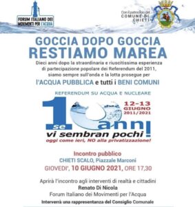 A 10 anni dal referendum, torniamo a parlare di acqua pubblica e di beni comuni: Chieti scalo, piazzale Marconi, giovedì 10 dalle 17,30, ha annunciato sulla sua pagina Facebook il consigliere comunale Edoardo Raimondi.  10 anni fa una coalizione ampia e determinata ha sancito una vittoria storica nel nostro Paese: con 27 milioni di Sì ai referendum su acqua, servizi pubblici e nucleare, abbiamo costretto ad un passo indietro chi per decenni ha imposto privatizzazioni e estrattivismo. 10 anni dopo , in piena pandemia, quella vittoria basata sulla difesa dei  beni comuni e sull’affermazione dei diritti di tutti e sui profitti di pochi ,ha un significato ancora più attuale – dice ancora Raimondi.