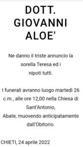 Addio a una vera, benemerita istituzione dello sport teatino. È scomparso il dottor Giovanni Aloè, il fondatore della “Falco Azzurro”. I funerali martedì alle 12 nella Chiesa di Sant’Antonio non lontana da quella via Sette Dolori dove nel palazzo avito Giovanni ha sempre abitato. Laureato in Legge, funzionario della Soprintendenza Archeologica, la vasta popolarità del dott. Aloè si deve all’impegno da lui profuso per decenni nello sport, segnatamente nell’atletica leggera.