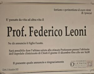Il Sindaco di Chieti e l’Amministrazione tutta esprimono profondo cordoglio per la scomparsa del professor Federico Leoni, figura di grande spessore culturale e umano, punto di riferimento per generazioni di studenti e per l’intera comunità teatina.