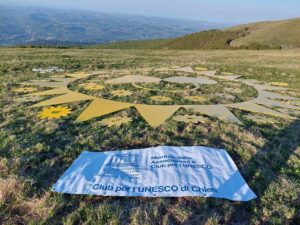Ad attendere la tappa del Giro d’Italia sulla Maiella, in località Mammarosa di Pretoro, ecco un’opera di Land Art che riproduce la “PRESENTOSA” installata sulla “MAJELLA GEOPARK”, di recente proclamata GeoParco Mondiale Unesco. L’installazione in legno del diametro di 12 metri, rappresenta la PRESENTOSA, il capolavoro dell’arte orafa della tradizione abruzzese, un gioiello settecentesco che viene tuttora realizzato dagli orafi artigiani dell’Abruzzo: un pegno d’amore che ricorda i rosoni delle nostre cattedrali. L’opera installata vuole essere un dono alla Montagna Madre, riconosciuta patrimonio Mondiale Unesco, ornata a festa con il gioiello più bello per accogliere il Giro e farsi conoscere in ogni luogo, grazie alle riprese degli elicotteri al seguito per la radiocronaca. Da un’idea di Antonio Corrado l’installazione è stata realizzata in legno dal Maestro Francesco Carullo , in stretta sinergia con il Club per l’Unesco di Chieti, l’Ente Mostra Artigianato Artistico Abruzzese, il Comune di Pretoro e grazie alla collaborazione del Parco Nazionale della Maiella. L’Ente Mostra dell’Artigianato Artistico Abruzzese ha ritenuto di voler curare la realizzazione di questo importante manufatto, con la speranza che venga recepita la rilevanza di avere in Abruzzo un marchio di qualità che contraddistingua l’artigianato artistico, e si occuperà dell’installazione del manufatto sapientemente realizzato con le nuove tecnologie digitali dal M° Francesco Carullo. La Presentosa ha due cuori: un binomio d’amore come montagna e mare, uomo e ambiente, arte e natura. Un gioiello che evoca la grandiosità dell’arte orafa abruzzese, che ha visto grandi interpreti e maestri come Nicola da Guardiagrele, un gioiello che lega alla sacralità di un pegno d’amore, la sacralità dei rosoni delle nostre cattedrali. Un dono come pegno a pazientare il sicuro ritorno dalla lunga transumanza … Ricordiamo, infine, la descrizione che ne fa Gabriele d’Annunzio nel “Trionfo della morte”, testo che descrive il promontorio sul Trabocco del Turchino a San Vito Marina: “Portava agli orecchi due grevi cerchi d’oro e sul petto la Presentosa: una grande stella di filigrana con in mezzo due cuori”.