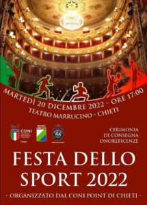 Si svolgerà il prossimo 20 dicembre al Teatro Marrucino di Chieti la Festa dello Sport 2022 organizzata dal Coni Point di Chieti (inizio ore 17.00). Saranno oltre 140 i premiati fra atleti, dirigenti e società della provincia di Chieti che si sono distinti nell’anno 2022 raggiungendo obiettivi di prestigio in tante discipline sportive sia a livello nazionale che internazionale.