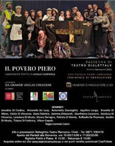 Domani, venerdì 12 maggio, alle ore 21:00 ci sarà la cerimonia di premiazione della sesta edizione della Rassegna di Teatro Dialettale “Premio Marrucino 2023”, organizzata dall’Istituzione Deputazione Teatrale Teatro Marrucino presieduta dal Presidente Ing. Giustino Angeloni e dal Direttore Amministrativo Dott. Cesare Di Martino e dal Comitato Regionale Fita Abruzzo (Federazione Italiana Teatro Amatori) presieduto dal Presidente Antonio Potere, con il patrocinio della Regione Abruzzo e del Comune di Chieti.