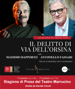 Sabato 14 (ore 21.00) e domenica 15 gennaio (ore 17.30) Massimo Dapporto e Antonello Fassari saranno i protagonisti del primo appuntamento della “Stagione di Prosa” del «Teatro Marrucino» diretta dal maestro Davide Cavuti; in scena lo spettacolo «Il delitto di via dell’Orsina» di Eugène-Marin Labiche per la regia di Andrée Ruth Shammah. Con Dapporto e Fassari saliranno sul palcoscenico Susanna Marcomeni, Marco Balbi, Andrea Soffiantini, Christian Pradella, Luca Cesa-Bianchi; la produzione è del «Teatro Franco Parenti» di Milano e della «Fondazione Teatro della Toscana».