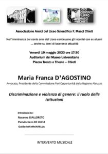 L’Associazione Amici del Liceo Scientifico F. Masci di Chieti, presieduta dalla Professoressa Rosanna Gialloreto, propone alla cittadinanza teatina, nel pomeriggio odierno, un nuovo ed interessantissimo evento, che si svolgerà presso l’Auditorium del Museo Universitario, in Piazza Trento e Trieste: la relatrice Maria Franca D’Agostino, Avvocato, Presidente della Commissione Pari Opportunità della Regione Abruzzo, affronterà il tema “Discriminazione e violenza di genere: il ruolo delle istituzioni”. La cronaca nazionale, purtroppo, riporta quasi quotidianamente episodi di stupri, violenze, ricatti e tante altre situazioni di degrado ed umiliazione, che troppo spesso hanno un epilogo tragico.