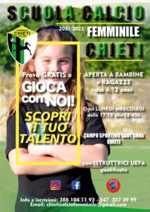 Lunedì 6 settembre riapre la Scuola Calcio del Chieti Femminile. “Prova gratis. Gioca con noi, Scopri il tuo talento” è lo slogan per il lancio della nuova iniziativa della stagione 2021/22. La scuola è aperta a bambine e ragazze dai 4 ai 12 anni, si avvale – come sempre – di istruttrici Uefa qualificate. Le lezioni si tengono ogni lunedì e mercoledì dalle 17.15 alle 18.45 al campo di Sant’Anna. Per informazioni 388 1041193 oppure 347 3573999.
