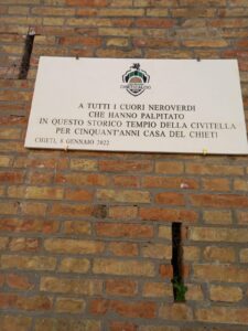 Dopo lo scoprimento della targa c’è stata la Messa celebrata dall’Arcivescovo Mons. Bruno Forte in San Giustino, quale atto di apertura dell’anno. Purtroppo alcune manifestazioni in cantiere sono state rinviate per cause legate alla pandemia ma a partire dal 23 gennaio, giorno di Chieti Recanatese, è iniziata la serie dei riconoscimenti agli ex neroverdi con la consegna di targhe ricordo, L’iniziativa è stata ripetuta nelle successive partite disputate allo stadio Angelini (Nereto, Porto d’Ascoli, Vastogrardi) fino al clou di domenica scorsa quando in occasione del derby contro la Vastese l’omaggio ha coinvolto tre leder della Curva Volpi che hanno ricevuto le targhe da famigliari di tre “Angeli Neroverdi”, tifosi scomparsi.