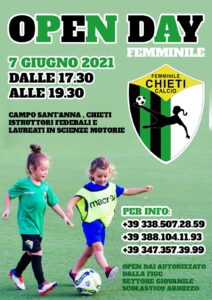 Uno dei progetti ai quali la società tiene in modo particolare è quello della Scuola Calcio Femminile perché alla sua crescita e al suo sviluppo è legato il futuro stesso del club neroverde. In questa ottica si inserisce il nuovo “Open Day” organizzato per il prossimo 7 giugno, dalle 17,30 alle 19,30, presso il campo Sant’Anna. Saranno presenti istruttori federali e laureati in scienze motorie. L’iniziativa è autorizzata dalla Federcalcio, settore giovanile scolastico Abruzzo. Il Chieti femminile ha sempre svolto un’azione di promozione e divulgazione dell’attività presso le scuole della città per suscitare interesse verso il calcio femminile fin dalla giovanissima età. L’Open Day di lunedì prossimo rappresenta la sintesi di questa opera di sensibilizzazione. Ampliando la base delle praticanti si garantisce un futuro al calcio femminile. Infatti gli slogan per il lancio dell’iniziativa sono “A piccoli passi per costruire qualcosa di grande”, “Per crescere bisogna lavorare tutti i giorni, noi vogliamo farlo con te”.