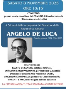 CASALINCONTRADA – In occasione del cinquantesimo anniversario della scomparsa dell’ingegnere, senatore e ministro delle Poste Italiane Angelo De Luca (Casalincontrada 1904 – Chieti 1975), il Comune organizza un convegno commemorativo sabato 8 novembre, alle ore 10:15, nella sala consiliare del municipio. L’iniziativa, promossa dall’amministrazione comunale, intende rendere omaggio a una delle figure più rappresentative della storia politica e istituzionale abruzzese, che dedicò la propria attività pubblica allo sviluppo della terra d’origine e al servizio del Paese.