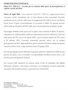 “I soci della S.S. Chieti FC 1922 società a responsabilità limitata rappresentanti l’intera compagine sociale comunicano che in data odierna è stato sottoscritto l’accordo preliminare per la cessione delle quote di maggioranza del club in favore del Dottor Ettore Serra il quale, contestualmente, ha esercitato il diritto di opzione previsto nell’accordo per l’acquisto del 60% delle quote di partecipazione al capitale sociale. Il passaggio definitivo delle quote per le quali è stato esercitato il diritto di opzione, subordinato al verificarsi delle condizioni espressamente previste nell’intesa, è previsto nella misura del 30% entro il 1° agosto 2022 e per la seconda tranche del 30% entro il 28 febbraio 2023.