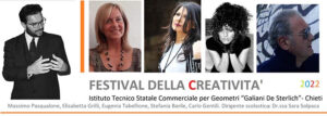 Al via il “Festival della creatività” all’Istituto Tecnico Statale Commerciale per Geometri “Galiani De Sterlich” di Chieti coordinato dal dirigente scolastico dr.ssa Sara Solipaca. Si tratta di un progetto in collaborazione con il Ministero dell’Istruzione e con l’ Unione Europea.   I ragazzi del quarto (indirizzo “grafica” e “turismo”)  incontreranno quattro esperti del settore artistico/creativo. Con il coordinamento generale del professore e critico Massimo Pasqualone, si alterneranno:  Carlo Gentili sul tema della “creatività” (25 febbraio), Elisabetta Grilli sul tema “I gatti nell’arte e nella letteratura” (28 marzo), Stefania Barile “la creatività nel l’arte contemporanea” (22 aprile), Eugenia Tabellione in “Psicologia della creatività” (16 maggio).  “La creatività – sottolineano gli organizzatori- è l’arma vincente per affrontare questi tempi così incerti, ma va comunicata agli studenti in modo attrattivo, oseremmo dire “bello” (in greco  “Kalos” vuol dire  attrarre).