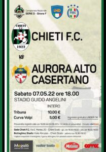 Da domani, mercoledì 4 maggio, a partire dalle 16.00, via alla prevendita dei biglietti per la gara Chieti-Aurora Alto Casertano che sarà anticipata a sabato (stadio Angelini, ore 18.00). Modalità e prezzi non hanno subito variazioni. Tagliandi acquistabili nei punti che fanno capo al circuito ciaotickets o sul relativo sito internet. Tribuna 10 euro (+ 1 diritti di prevendita), Curva 5 euro (+1), settore ospiti 11.50 euro (prezzo unico). Nel pomeriggio della gara sarà aperto il botteghino dello stadio dalle 15.30 alle 18. La vendita presso la sede sociale in via Enrico Mattei 20, a Chieti Scalo, ci sarà nelle giornate di giovedì e venerdì sempre nel pomeriggio dalle 16 alle 19. Sabato aperto il solo botteghino dell’Angelini.