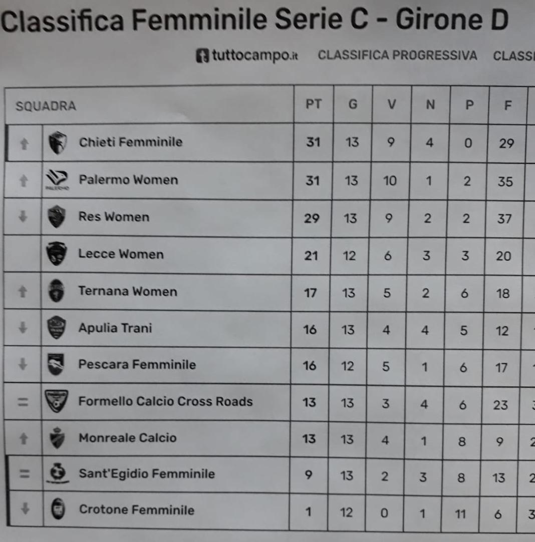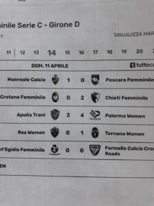 Classifica rivoluzionata in testa al girone D della serie C del campionato di calcio femminile. La sconfitta interna della capolista Res Roma contro Terni (0-1) ha propiziato il sorpasso al vertice della coppia formatada Chieti (unica squadra imbattuta) e Palermo, che ha vinto a Trani al termine di una sofferta gara (3-4).. Le ragazze neroverdi e le palermitane guidano il plotone con due punti di vantaggio sulle giallorosse. Domenica prossima è in programma Palermo-Roma e il Chieti che affronterà in casa Terni potrebbe approfittarne,