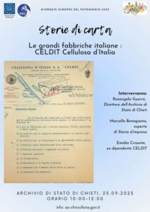 Per le GEP – Giornate Europee del Patrimonio (European Heritage Days), dedicate al tema “Patrimonio InVita”, l’Archivio di Stato di Chieti (via F. Ferri, 27) narra storie in merito all’esperienza CELDIT sul territorio, ed espone una selezione di documenti.