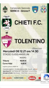 Per Chieti-Tolentino in programma dopodomani mercoledì 8 dicembre (la tredicesima giornata è un turno infrasettimanale) i biglietti sono già in vendita da oggi pomeriggio, dalle 16 alle 19 presso la sede sociale di via Enrico Mattei 20 a Chieti Scalo. I tagliandi sono anche acquistabili in tutti gli esercizi del circuito Ciaotickets e sul relativo sito internet. Presso la sede del club ecco gli orari: oggi e domani dalle 16 alle 19; mercoledì dalle 10 alle12.30. Questi i prezzi: tribuna euro 10; Curva Volpi euro 5. Il giorno della gara sarà aperto il botteghino dello stadio Angelini (lato tribuna, solo settori locali) dalle 13.30 alle14.30. Gli under 14 hanno diritto all’ingresso gratuito con biglietto omaggio che tuttavia va richiesto obbligatoriamente presso la sede sociale o all’indirizzo prenotazioni.chietifc@gmail.com (in questo caso biglietto inviato in formato elettronico e dovrà essere stampato prima di entrare allo stadio). Il circuito Ciaotickets non rilascia biglietti omaggio. I biglietti del settore ospiti possono essere acquisati dai tifosi del Tolentino nelle rivendite Ciaotickets al costo di euro 11.50 (botteghini chiusi per tale settore nel giorno della gara). E’ importante ricordare che l’accesso allo stadio Angelini sarà consentito esclusivamente ai soggetti muniti di Green Pass Rinforzato, già in possesso di tutti i vaccinati o guariti dal covid 19.