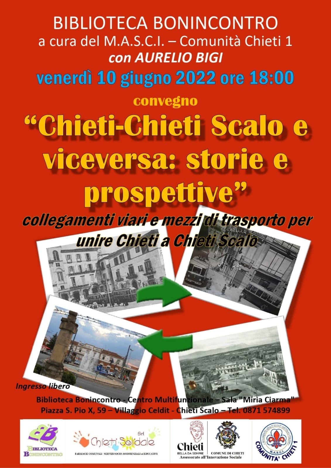 Venerdì 10 giugno, alle 18.00, presso la Biblioteca Bonincontro, in piazza S. Pio X del Villaggio Celdit a Chieti Scalo, il Movimento Adulti Scout Cattolici Italiani (MASCI Chieti 1) presenta Chieti – Chieti Scalo e viceversa: storie e prospettive. Relatore sarà Aurelio Bigi, cultore di storia e autore di vari libri, sugli scout in Abruzzo, sul Venerdì Santo a Chieti, su Chieti nell’Ottocento. Il suo lavoro più recente, sui piccoli e grandi centri, è intitolato “Chieti e l’Abruzzo Citeriore nel Settecento”.