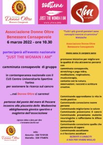 Prosegue l’attività di promozione culturale dell’Associazione Donne Oltre Benessere consapevole, onlus nata pochi mesi fa e presieduta con entusiasmo e professionalità della Presidente Dott.sa Assunta Di Basilico. L’associazione ha aderito all’evento nazionale “Just the woman i am”, in programma il 6 Marzo alle ore 10:30. E’ prevista una camminata consapevole di gruppo in contemporanea nazionale con il CUS di Torino e l’evento ha come finalità la promozione della ricerca sul Cancro.