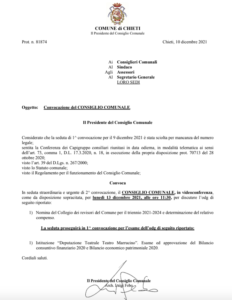 Convocato per domani, 13 dicembre 2021 alle ore 11,30, in seduta straordinaria e urgente in seconda adunanza, il Consiglio Comunale di Chieti, chiamato a decidere sulla composizione del Collegio dei Revisori del Comune per il triennio 2021-2024 con la determinazione del relativo compenso.