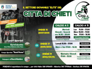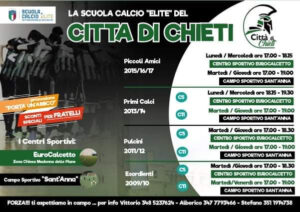 Partono i corsi organizzati dal “Città di Chieti” (settore giovanile elite) per calcio a 5 e calcio a 11. I centri sportivi interessati sono: Eurocalcetto (zona Chiesa Madonna delle Piane), il campo Sant’Anna e il palasport di Bucchianico. Corsi riservati agli under 15 (nati 2007/2008), under 17 (2005/2006) e under 19 (2002/03/04). Ci sono poi i corsi (nei medesimi impianti) per Piccoli Amici (2015/16/17), Primi Calci (2013/14), Pulcini 2011/12) ed Esordienti (2009/10). Gli iscritti che rientrano nelle ultime tre class possono seguire sia il calcio a 5 sia quello a 11. Giorni e orari della didattica nelle due locandine. Per informazioni Vittorio 348 5237624 – Alberico 347 7793466 – Stefano 3511914738.