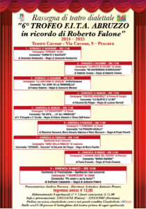 Dopo il grande successo della quinta edizione, il Comitato Regionale F.I.T.A. Abruzzo (Federazione Italiana Teatro Amatori), presieduto dal Presidente Antonio Potere, autore di numerose opere teatrali, nonchè Presidente e regista della Compagnia teatrale “I Marrucini” di Chieti con ben 50 anni di attività teatrale nel ruolo di Direttore Artistico di numerose rassegne amatoriali abruzzesi, ha organizzato la quinta edizione della Rassegna di teatro dialettale “6° Trofeo F.I.T.A. Abruzzo – in ricordo di Roberto Falone” che si terrà presso il Teatro Cavour in Via Cavour 9 a Pescara, da domenica 17 novembre 2024 alle ore 17:00 ed è composta da ben 9 spettacoli, di cui sette in concorso e due fuori concorso e terminerà domenica 30 marzo 2025 con la Cerimonia di Premiazione della Rassegna e l’altro spettacolo fuori concorso. Le sette compagnie teatrali in concorso saranno giudicate da due giurie: popolare e tecnica.