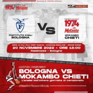 Dopo il brutto scivolone di Mantova, la Mokambo Chieti Basket è impegnata domani nella seconda trasferta consecutiva. I biancorossi giocheranno sul parquet di uno dei palazzetti che hanno fatto la storia del basket italiano, il PalaDozza di Bologna, ospiti della Fortitudo (ore 18), guidata da coach Dalmonte. I biancoblu sono una formazione di grande talento, coperta in tutti i ruoli, il calore dei tifosi sarà sicuramente un’arma in più.