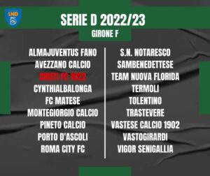 E’ ufficiale la composizione del Girone F di serie D. Raggruppamento geograficamente ancora composto da abruzzesi, laziali, molisane e da una formazione campana. In dettaglio. 5 abruzzesi (Avezzano, Chieti, Pineto, Notaresco, Vastese); 6 Marche (Fano, Montegiorgio, Porto d’Ascoli, Samb, Tolentino, Vigor Senigallia); 4 Lazio (CynthiaAlbalonga, Roma City, Team Nuova Florida, Trastevere); 2 Molise (Termoli, Vastogirardi); 1 Campania (Matese). Campionato molto difficile.