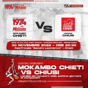 Dopo il passo falso interno contro Rimini, la Mokambo Chieti Basket affronta domani il match valido quale recupero della settima giornata: ospite al PalaTricalle “Sandro Leombroni” il San Giobbe Chiusi (ore 20,30).
