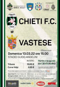 “La gara, grazie anche al patrocinio del Comune di Chieti, sancirà l’inizio dei festeggiamenti per il Centenario da parte delle tifoseria organizzata, per questo è stato varato un prezzo speciale in Curva Volpi: Tribuna euro 10, Curva Volpi 2 euro. Il giorno della gara, dalle 11,30 alle 15.00, sarà aperto il botteghino dello stadio, lato tribuna (solo settori locali). Oltre ai punti vendita, sarà aperta, come al solito, anche la sede sociale di via Enrico Mattei, 20, a Chieti Scalo con i seguenti orari: venerdì 16.00-19.00; sabato: 10.00-12-00 (domenica aperto solo il botteghino dello stadio, non la sede sociale)”.