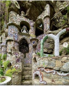 I Visconti Venosta passano l’estate in Valtellina a Grosio. Nicola li segue e conosce un ragazza del posto, Domenica, che diventerà sua moglie. Cinque anni di rapporti epistolari, Nicola è ancora cuoco in un ristorante a Torino sul colle di Superga. Fa anche il ferroviere. Infine il matrimonio. Mette su famiglia a Grosio in via Rovaschiera dove c’è uno sperone roccioso (la mente va alla rupe che sovrasta Pizzoferrato). E pensa di farci qualcosa quando non è impegnato nel lavoro. Comincia così, un pochino alla volta, negli Anni 80. È andato avanti per tutto questo tempo salendo gradino dopo gradino, fino ad oltreropassare il numero di 200. Il tutto meravigliosamente decorato.