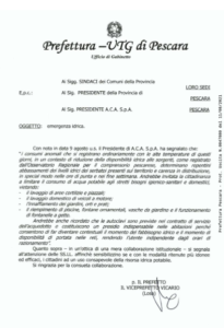 Alle 17,00 è iniziata la riunione tra i verti dell’ACA e i sindaci interessati all’emergenza idrica  per fare il punto della situazione e concordare le modalità di interruzione della fornitura di acqua. Intanto la Prefettura di Pescara oggi ha inviato  una nota a tutti i sindaci della Provincia di Pescara affinché sensibilizzino, se e con le modalità ritenute più idonee ed efficaci, i cittadini ad un uso consapevole della risorsa idrica potabile.