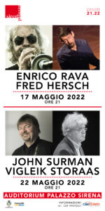 Doppio appuntamento con nomi straordinari all’«Auditorium Sirena»di Francavilla al Mare, diretta dal maestro Davide Cavuti: martedì 17 maggio alle ore 21 è previsto il concerto conEnrico Rava e Fred Hersch; domenica 22 maggio (ore 21) un’altra icona del jazz mondiale, il sassofonista John Surman accompagnato dal pianistaVigleik Storaas.