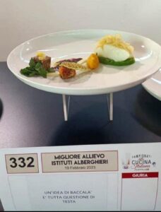 “Un’idea di Baccalà: è tutta questione di testa” è il nome del piatto – connubio tecnico-concettuale con protagonisti il baccalà e la coppa di suino abruzzese – con il quale Fabrizio Tucci ha rappresentato l’Abruzzo, grazie al sostegno della scuola alberghiera e del docente di cucina Ermanno Di Paolo che ha guidato il ragazzo in tutto il percorso di lavorazione del piatto.