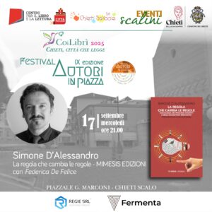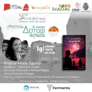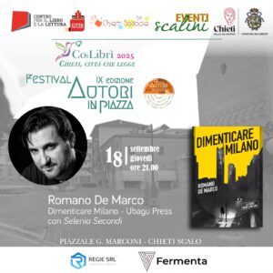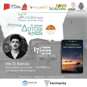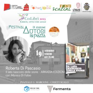 Torna il Festival Autori in piazza e prende inizio mercoledì 17 settembre alle ore 21.00 in Piazza G. Marconi a Chieti Scalo. Tre giorni di incontri, confronti e presentazioni aperti alla città. Quest’anno il festival giunto alla sua nona edizione e patrocinato dal Comune, si svolge nell’ambito di CoiLibrì FEST 2025, evento ricompreso nelle iniziative del Patto per la lettura di Chieti città che legge e degli Eventi Scalini e prevede come ogni anno la presenza di autrici e autori che dialogheranno con giornaliste e giornalisti dei loro libri.