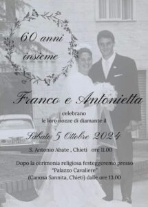 Oggi nella Chiesa di Sant’Antonio Abate sarà celebrata una cerimonia speciale: un altro “sì” 60 anni dopo il fatidico primo. Lo pronunceranno Franco Rosati e Antonietta Marrone. Qui, in questa stessa Chiesa di via Arniense, il 5 ottobre 1964 il 21 enne calciatore e la giovane studentessa si unirono in matrimonio ed oggi festeggiano le nozze di diamante. Franco, reduce dall’indimenticabile campionato disputato con la maglia neroverde (1963/64, allenatore il fratellone Tom), era appena approdato in serie A (Messina), lei ragazza teatina figlia di un grande tifoso del Chieti, Glauco Marrone, e questo provocò la scintilla dell’amore che ha accompagnato un lungo e felice cammino, mano nella mano. Oggi, circondati dall’affetto dei figli Gianluca, Elvira e Sabina, delle loro famiglie, dei tanti parenti e amici, rinnoveranno con lo stesso profondo sentimento di allora la reciproca promessa. Seguirà la festa presso Palazzo Cavaliere a Canosa Sannita e il viaggio di nozze. Luna di miele, anzi di diamante. Auguroni!