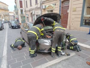 Storia a lieto fine per un gattino randagio salvato dai vigili del fuoco dopo essere rimasto incastrato nel vano motore di un’automobile.L’episodio si è verificato nella mattinata di oggi lungo i parcheggi laterali di Via Arniense. I continui miagolii del gattino hanno richiamato l’attenzione dei passanti, tra i quali il proprietario dell’automobile Seat Leon che ha allertato i vigili del fuoco. Dopo diversi tentativi gli operatori sono riusciti a tirare fuori i gattino visibilmente scosso ed impaurito, ma che ha già trovato un nuovo padrone tra i passanti.