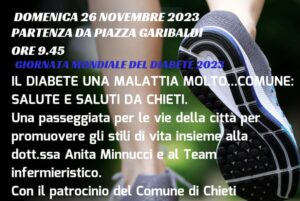 Una passeggiata tra le vie della città per promuovere stili di vita più salutari e la prevenzione del diabete, quella che si svolgerà domenica 26 novembre, con partenza alle 9.45 da piazza Garibaldi, in occasione della Giornata Mondiale del Diabete. L’evento, a cura della diabetologa Anita Minnucci, a referente sul territorio dell’associazione Medici Diabetologi della Federazione delle Società Diabetologiche Italiane e patrocinato dal Comune di Chieti, si svolgerà con la collaborazione del team infermieristico.
