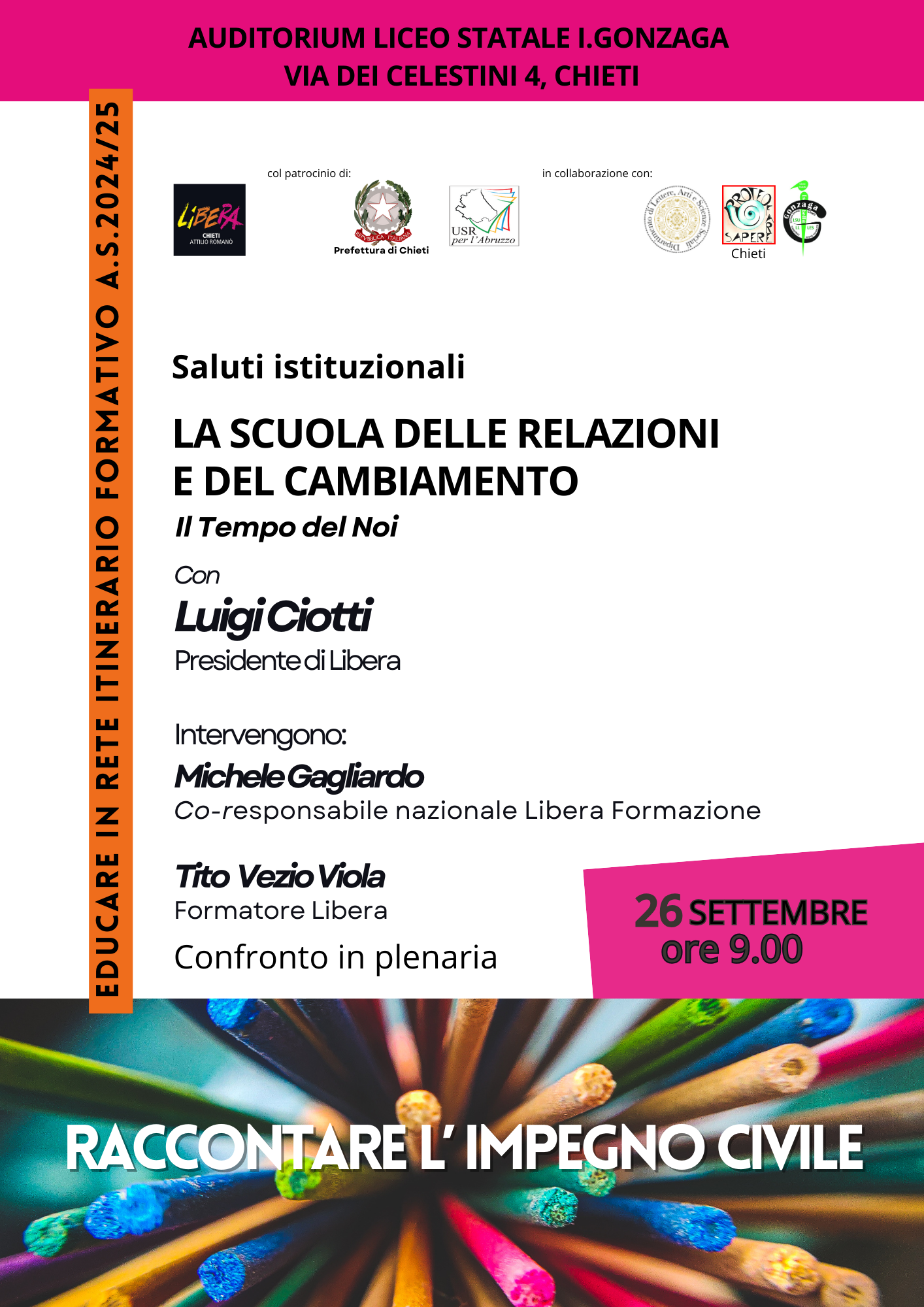 Don Luigi Ciotti, Presidente di Libera, apre a Chieti il nuovo percorso formativo per le scuole “raccontare l’impegno civile”