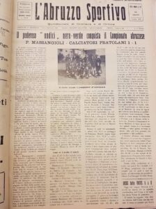 La palla è ai bianconeri ma subito i neroverdi se ne impossessano e si portano nell’area avversaria. Reazione dei pratolani e Colalongo alle 17.48 salva in corner che è infruttuoso. Dopo pochi minuti Rizzoli deve uscire per la rottura di un dente ma rientra subito. Una discesa bianconera non sortisce effetto perché il tiro di Pupillo finisce fuori. Anche due tiri di Iaconelli e Gennari finiscono fuori e poco dopo Colalongo libera con un bel rimando. Alle 17.56 registriamo un calcio di punizione contro Pratola. Fabris tira e allunga a Palumbo che fugge ed eseguisce il cross che però non viene raccolto da Tognolini. Indi un tiro di Rizzoli finisce fuori. Intanto il gol va maturando e infatti alle 18.1′ su passaggio di Pampana Rizzoli segna imparabilmente. Alle 18.6′ un calcio di punizione contro la Massangioli è tirato fuori da Iaconelli. L’attacco neroverde invade nuovamente l’area bianconera e alle 18.8′ Cianfaglione deve esibirsi in una bella parata, indi alle 18.9′ l’arbitro concede ai chietini un calcio di punizione e alle 18.13′ Cianfaglione deve parare un tiro di Tognolini. I pratolani si scuotono e vanno al contrattacco costringendo gli avversari in corner alle 18.19′ Poco dopo D’Urbano eseguisce una bella parata. Ma i chietini alle 18.21′ beneficiano di un nuovo calcio di punizione. Tira Di Bernardo, Rizzoli riprende e si avvicina a Cianfaglione che para. Un nuovo calcio di punizione questa volta contro il Chieti fa nascere una volee sotto la porta di D’Urbano e così Iaconelli ha modo di pareggiare…”. La cronaca prosegue con il racconto del secondo tempo ma il risultato di 1-1 non cambierà. Fu così che la squadra neroverde conquistò il suo primo prestigioso successo: campione d’Abruzzo.