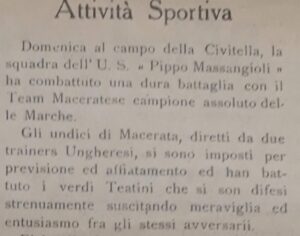 In un pezzo di pochi giorni fa abbiamo raccontato una “domenica di sport” a Chieti all’inizio degli Anni 20. Ora riportiamo alla luce un’amichevole (ci furono andata e ritorno) contro l’allora fortissima Maceratese. C’è il commento apparso su “L’Azione Democratica” e lo scambio epistolare fra i sindaci delle due città. Sì, perché in quel tempo lontano un incontro di calcio era accompagnato dal reciproco saluto istituzionale da parte delle autorità locali, una consuetudine molto significativa della cordialità dei rapporti tra centri di diverse regioni. A proposito di Pippo Massangioli-Maceratese si legge sul quindicinale teatino: “Domenica al campo della Civitella la squadra della U:S: Pippo Massangioli ha combattuto una dura battaglia con il Team Maceratese campione assoluto delle Marche. Gli undici di Macerata diretti da due trainers ungheresi, si sono imposti per previsione ed affiatamento ed han battuto i verdi Teatini che si son difesi strenuamente suscitando meraviglia ed entusiasmo tra gli stessi avversari. E’ inutile fare ancora dei rilievi circa la squadra di Macerata che, nonostante in buona formazione,  non ci è apparsa all’altezza del suo nome. A dimostrare la nostra obiettività riportiamo il giudizio di un tecnico Maceratese sulla <P. Massangioli>. “L’U:S: di Chieti è buona come valori individuali: ha resistenza, slancio e buona padronanza della palla, abusa di dribbling e scarseggia di passaggi in profondità e di estensione… La squadra con un allenamento razionale e tecnico avrà un sicuro avvenire”.