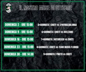 Il momento difficile che sta attraversando (due sconfitte consecutive, quattro gol subiti, attacco a secco) impone al Chieti una immediata e convincente reazione. Subito, all’inizio di un mese di ottobre pieno di impegni severissimi. Bisogna a tutti i costi invertire la tendenza, domani (stadio Angelini ore 15.00), contro i laziali del Cynthialbalonga che in classifica ha gli stessi punti del Chieti. Squadra indecifrabile in quanto capace di alternare cose apprezzabili ad altre meno anche per effetto di un calendario un po’ strambo: su quattro partite ne ha disputate tre in casa, nell’unica trasferta ha però vinto a San Benedetto. Vera incognita.