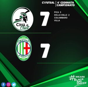 La ripresa vedrà un tutt’altro Orione che ci crede sfruttando tutti gli errori dei teatini anche se il secondo tempo si apre con Villa che ci porta sul 4-1 con un destro da fuori area preciso, ma non c’è nemmeno il tempo di festeggiare e arriva subito il 4-2. Si percepisce il piglio differente degli avversari ma ci riportiamo di nuovo sul +3 ancora con Pica (tripletta e 7 reti per il capocannoniere neroverde) da schema d’angolo. Il Città di Chieti commette il grave errore di deconcentrarsi e subisce due reti nel giro di poco tempo (doppietta di Di Nicola) e sul 5-4 gli ospiti rientrano definitamente in partita. Anzi l’Orione, nettamente più tranquillo, riesce anche a pareggiare con Maceroni mettendo in difficoltà i nostri ragazzi che soffrono ma riescono a ricompattarsi e a riportarsi in vantaggio con Columbaro: c’è una superiorità numerica grazie ad una espulsione che viene sfruttata dal mancino con una conclusione da fuori area per il nuovo vantaggio (6-5). Sulle ali dell’entusiasmo ci portiamo sul 7-5 ancora con Della Valle, bella finta sull’avversario e gran bolide di sinistro per il settimo gol. Mancano circa 3 minuti, manca ancora tanto e difatti l’Orione non si affligge e si riporta in carreggiata grazie al portiere di movimento che consente a Bussi di realizzare altre due reti che portano il risultato sul 7-7 finale.
