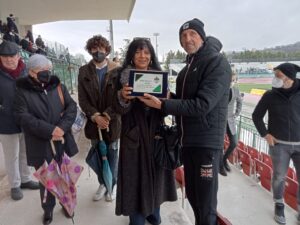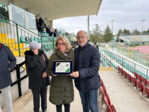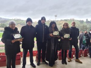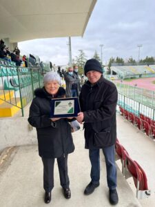 Prima del via di Chieti-Vastogirardi (finita 1-1), proseguendo un’ormai consolidata tradizione che ha avuto il suo primo atto il 23 gennaio (gara contro la Recanatese) e poi confermata nelle successive partite interne contro Nereto (30 gennaio) e Porto d’Ascoli (13 febbraio), il Comitato per il Centenario, presieduto da Stefano Marchionno, ha omaggiato tre neroverdi del passato: Tom Rosati, Claudio Carboncini e Pasquale Cavicchia. Membri del Comitato (Maurizio Formichetti, Lello Di Vito e Franco Zappacosta) hanno consegnato targhe ricordo a Barbara Rosati, figlia di Tom; a Giovanna Carboncini, moglie di Claudio, e a Floridea Cavicchia, moglie di Pasquale. Tom Rosati è stato calciatore e capitano della squadra negli Anni 50, poi l’ha allenata nel 1963/64 (promozione sfiorata in serie B) e nel 1981-82. Figura iconica nella storia del Chieti. Claudio Carboncini è stato difensore e capitano neroverde, quasi 150 presenze negli Anni 60 ai tempi della Civitella, giocatore popolare ancora oggi tra i tifosi teatini. Pasquale Cavicchia ha giocato nel Chieti nei primi Anni 70, acclamato goleador sul prato dello stadio Angelini per tre stagioni dal 1970 al 1973 (82 presenze e 20 reti).Indimenticabile la sua decisiva doppietta in un derby contro il Pescara nel febbraio 1971. È stato un momento bello e toccante.