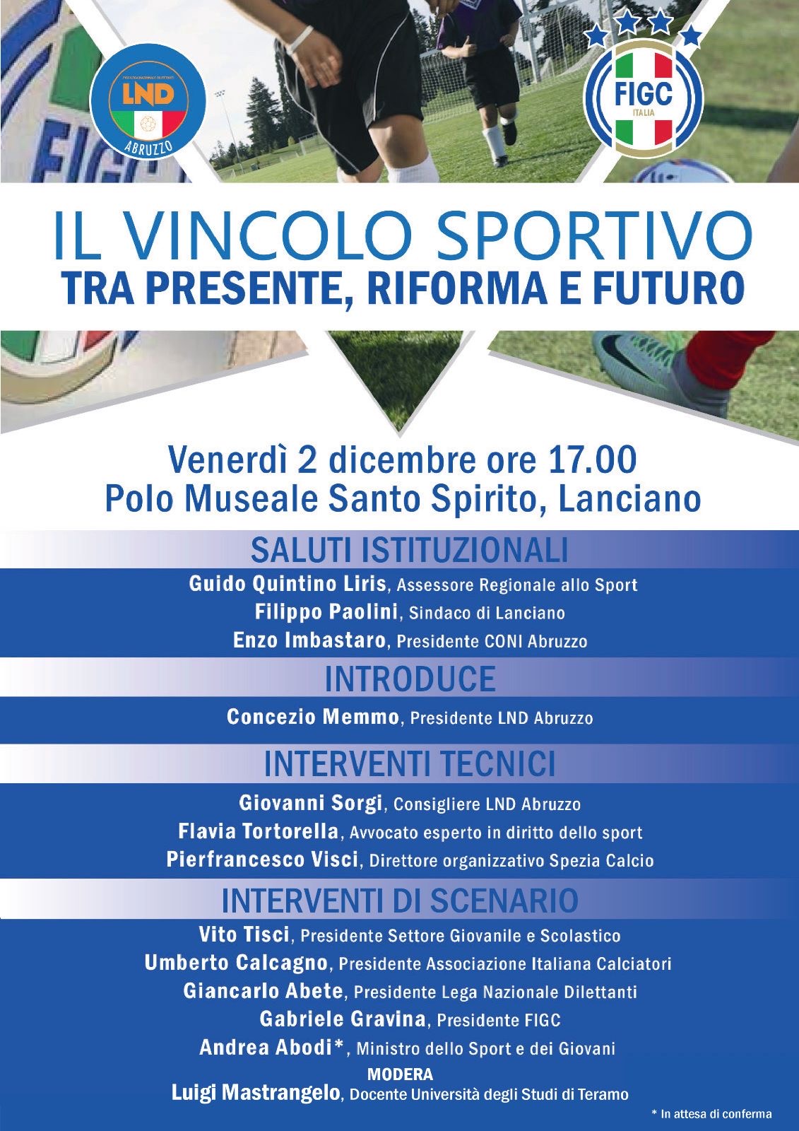 Di qui si passerà agli interventi tecnici con il consigliere LND Abruzzo, Giovanni Sorgi, l’avvocato esperto in diritto dello sport, Flavia Tortorella e il direttore organizzativo dello Spezia Calcio, Pierfrancesco Visci.