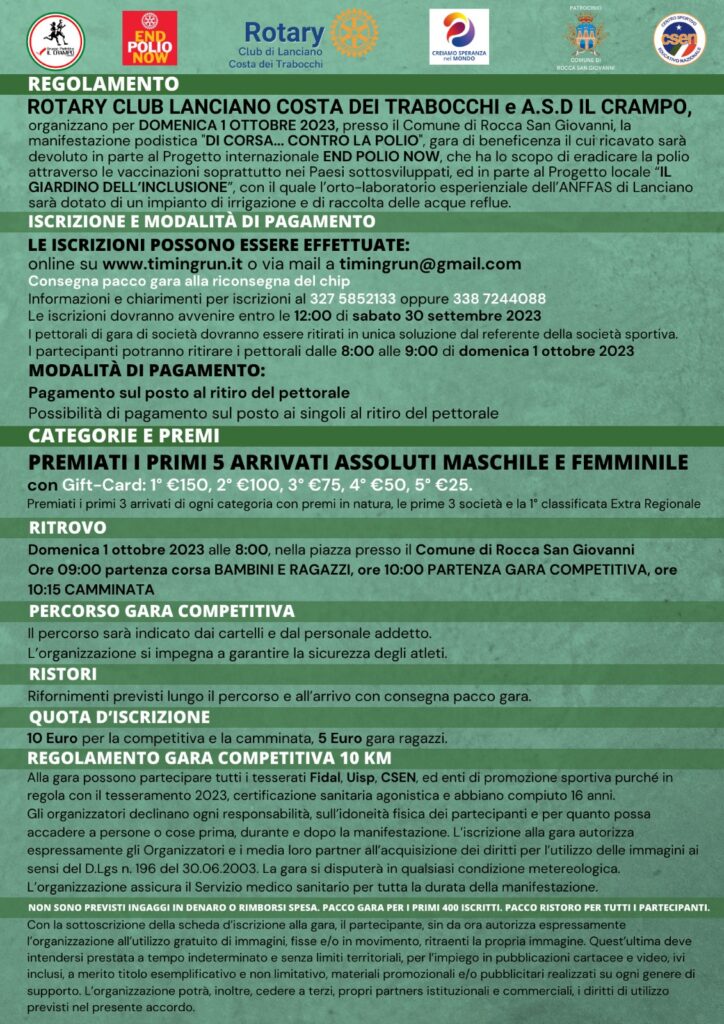 Il Rotary Club Lanciano Costa dei Trabocchi e l’Associazione Sportiva Dilettantistica Il Crampo, con il patrocinio del Comune di Rocca San Giovanni, organizzano per domenica 1° ottobre una gara podistica di beneficenza, finalizzata principalmente alla raccolta fondi per uno dei progetti più importanti del Rotary International: l’End Polio Now. Le somme raccolte contribuiranno