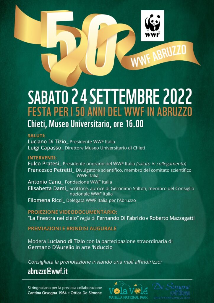 Sabato 24 settembre proprio a Chieti il WWF Abruzzo celebra quegli anni lontani con una festa, cui sono stati invitati i soci abruzzesi e i simpatizzanti dell’associazione del Panda. L’appuntamento è alle 16:00 presso l’auditorium del Museo universitario. La giornata, dopo i saluti istituzionali del Presidente nazionale del WWF, l’abruzzese Luciano Di Tizio, e del Direttore Museo Universitario Luigi Capasso, proseguirà con i saluti a distanza di Fulco Pratesi, presidente onorario dell’Associazione, e di Francesco Petretti, noto divulgatore scientifico e membro del comitato scientifico WWF. A seguire ci saranno gli interventi di Elisabetta Dami, scrittrice, autrice di Geronimo Stilton e membro del Consiglio nazionale WWF, di Antonio Canu, storico responsabile delle Oasi WWF, e di Filomena Ricci, attuale delegata WWF Italia per l’Abruzzo. Sarà inoltre proiettato il documentario naturalistico “La finestra nel cielo” di Fernando Di Fabrizio e Roberto Mazzagatti. Ad animare la giornata, oltre al presidente Di Tizio, per l’occasione moderatore, ci sarà la partecipazione straordinaria di Germano D’Aurelio in arte ‘Nduccio, amico e socio del WWF.