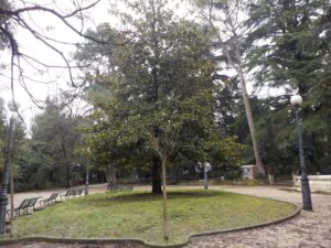 Magnolia grandiflora (questo il nome scientifico della specie presente alla Villa Comunale di Chieti) è una delle piante più antiche del mondo la cui esistenza sulla Terra è testimoniata, grazie a resti fossili, da oltre 90 milioni di anni, ben prima dell’estinzione dei dinosauri! Dopo l’ultima era glaciale è sopravvissuta in America e Asia e proprio dall’America è stata importata in Europa, in Inghilterra sin dal 1688 e in Francia dal 1740. Il nome è stato scelto in onore del grande botanico d’oltralpe Pierre Magnol (1638-1715). Si tratta di un albero imponente, che può facilmente diventare secolare, e che può raggiungere e superare i 20 m di altezza. Ha chioma ampia e conica con corteccia liscia, di colore grigio scuro. Le foglie sono grandi (tra i 12 e i 25 cm), sempreverdi, di forma obovato-oblunga e di consistenza coriacea con margine intero oppure a volte ondulato; la lamina superiore è verde brillante intenso, quella inferiore color ruggine. Fiori grandi (diametro fino a 20 cm) bianchi e intensamente profumati. Infruttescenza a forma di pigna cilindrica, con scaglie pelose verde brunastro, a protezione di semi di un bel colore rosso vivo e profumati.