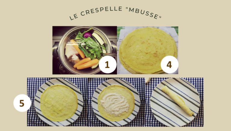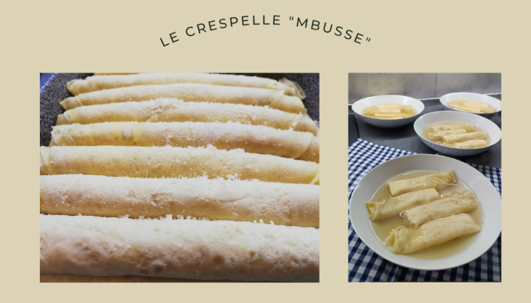 Nonna Maria comincia a pensare al menù di Pasqua nel quale non può mancare un piatto a base di brodo di gallina e quest’anno preparerà le famosissime scrippelle ‘mbusse – “inzuppate” – in un brodo ricco e saporito che penetrando nelle scrippelle ripiene di formaggio, le rende morbide e gustosissime. La ricetta è originaria del teramano ma è ormai diffusa in buona parte della regione. Il nome scrippelle sarebbe la forma dialettale del francese “crepe s’appelle” perché la ricetta deriverebbe dalle famosissime crepes francesi ma senza l’impiego di latte, particolare che rende il piatto adatto agli intolleranti al lattosio.
