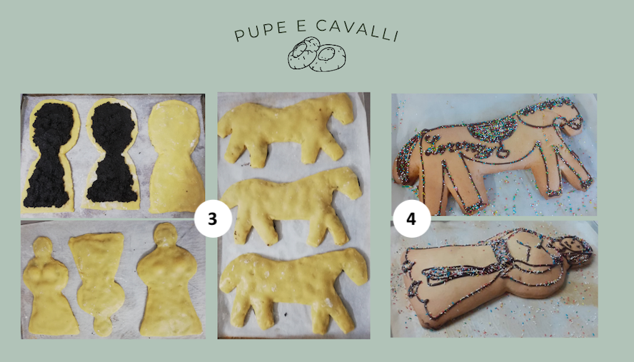 3. Stendete quindi la pasta fino ad ottenere una sfoglia di 5 mm circa. Aiutandovi con le teglie a forma di pupa o cavallo, o con forme realizzate con cartone, tagliate l’impasto. Per ogni dolce occorre una coppia di sfoglie. Sulla prima adagiate abbondante ripieno, lasciando libero il bordo di circa 1 cm (servirà per saldare il dolce). Ricoprite con la seconda sfoglia e saldate il dolce premendo sui bordi. Adagiate un uovo (ben pulito) sulla pancia della pupa o del cavallo e saldatelo al dolce utilizzando delle strisce di impasto. Terminata la preparazione di tutti i dolci, infornate in forno caldo a 180 gradi per circa 30 minuti.