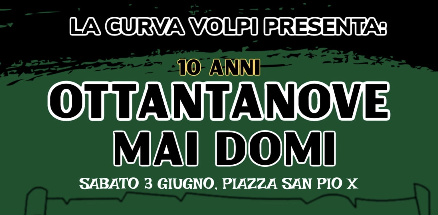 Quest’anno la festa dedicata a tutti i tifosi neroverdi avrà un significato in più: si festeggeranno i 10 anni di attività del gruppo Ottantanove. Un percorso lungo e tortuoso, ma carico di significato proprio per le difficoltà incontrate lungo la strada. Si svolgerà sabato 3 giugno l’evento di sport e intrattenimento in piazza San Pio X dove alle 15 prenderà inizio il torneo di street soccer in gabbia 3 contro 2 fra squadre di tifosi; alle ore 19.20 le premiazioni; alle 20.30 un momento di ricordo degli “angeli neroverdi”, in particolare di Alfredo, figlio mai dimenticato della Volpi, e alle ore 21 il concerto dei Radiosupernova. Sarà una giornata all’insegna del divertimento neroverde, ma anche di solidarietà, perchè gli organizzatori hanno disposto di devolvere il ricavato delle attività alle associazioni del quartiere.