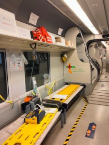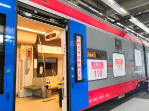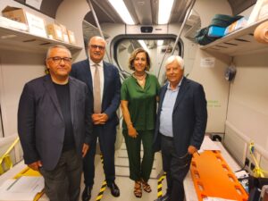 Il treno-ambulanza è pronto. Pronto anche, e soprattutto, per diventare un ulteriore strumento di supporto in caso di maxi-emergenze.È stato, infatti, presentato questa mattina il treno-ambulanza della TUA nell’officina ferroviaria di Torre della Madonna di Lanciano. L’idea, che si è concretizzata grazie al fattivo e reciproco supporto tra Regione Abruzzo, TUA, Asl 2 Lanciano-Vasto-Chieti, 118 e Protezione Civile regionali, è nata dall’esigenza di garantire un presidio sanitario supplementare in occasione dell’evento del Jova Beach Party, in programma domani e dopodomani sul lungomare di Vasto. Il convoglio della società di trasporti abruzzese è stato trasformato in un presidio di pronto soccorso mobile in grado di offrire diverse soluzioni sanitarie e, all’occorrenza, mettersi in moto, con “marcia privilegiata”, sull’infrastruttura ferroviaria nazionale di Rete Ferroviaria Italiana (RFI), per raggiungere da Vasto gli ospedali di Ortona e Pescara rispettivamente in 15 e 25 minuti. L’elettrotreno Alstom “Lupetto” della TUA trasformato in ambulanza presenta a bordo la seguente dotazione: due monitor elettrocardiografo lifeoak 15 con modalità di trasmissione del tracciato ECG, un aspiratore bronchiale, un ventilatore polmonare, due capnometri saturimetri, due bombole per ossigeno, un defibrillatore semiautomatico (oltre a quello già in dotazione sul treno), kit respiratorio, traumatico e cardiologico, due zaini da rianimazione, un massaggiatore cardiaco, farmaci vari, materiale per la medicazione, liquidi per infusione, un frigo per i farmaci e una postazione per l’esecuzione dei tamponi. Appena ricevuto l’ok da parte della Prefettura di Chieti, sono stati avviati i lavori per attrezzare il treno coordinati dalla divisione ferroviaria di TUA, diretta da Enrico Dolfi; una delle novità tecniche importanti è rappresentata dalla “marcia privilegiata”, cioè una sorta di corridoio prioritario concesso al treno. Infatti, in caso di emergenza, il Centro Operativo di TUA (COIF) si interfaccerà col Dirigente Centrale Coordinatore Movimento della Sala Circolazione di Pescara che autorizzerà la “precedenza” al treno TUA sui binari che collegano la stazione di Vasto-San Salvo a quelle di Ortona e Pescara. Una volta ottenuto il segnale verde da parte di RFI, il macchinista della TUA, su indicazione del personale sanitario a bordo del treno, potrà raggiungere il presidio ospedaliero di Ortona o quello di Pescara. “Voglio innanzitutto ringraziare gli enti tecnici che hanno garantito la massima collaborazione – ha dichiarato Gabriele De Angelis, presidente TUA – in particolar modo RFI, ma tutta la macchina organizzativa che si è messa in moto. Ritengo che questa iniziativa – ha continuato De Angelis – si possa inquadrare come una best practice da utilizzare, in modo strutturato, in caso di maxi-emergenze che si dovessero verificare nella nostra regione”. Il treno-ambulanza da domani verrà attestato sui binari della stazione di Vasto-San Salvo con il proprio personale equipaggi dove rimarrà fino alla mattina del 21 agosto. “L’aspetto sociale di questa iniziativa – ha concluso il presidente De Angelis – è molto significativo perché è riuscito ad evidenziare come soggetti istituzionali della nostra regione hanno collaborato con uno scopo comune ed hanno concretizzato un prodotto altrettanto comune a favore della collettività”.(nella foto di gruppo da sx a dx Pasquale Di Nardo, Gabriele De Angelis, Anna Lisa Bucci e Antonio Prospero)